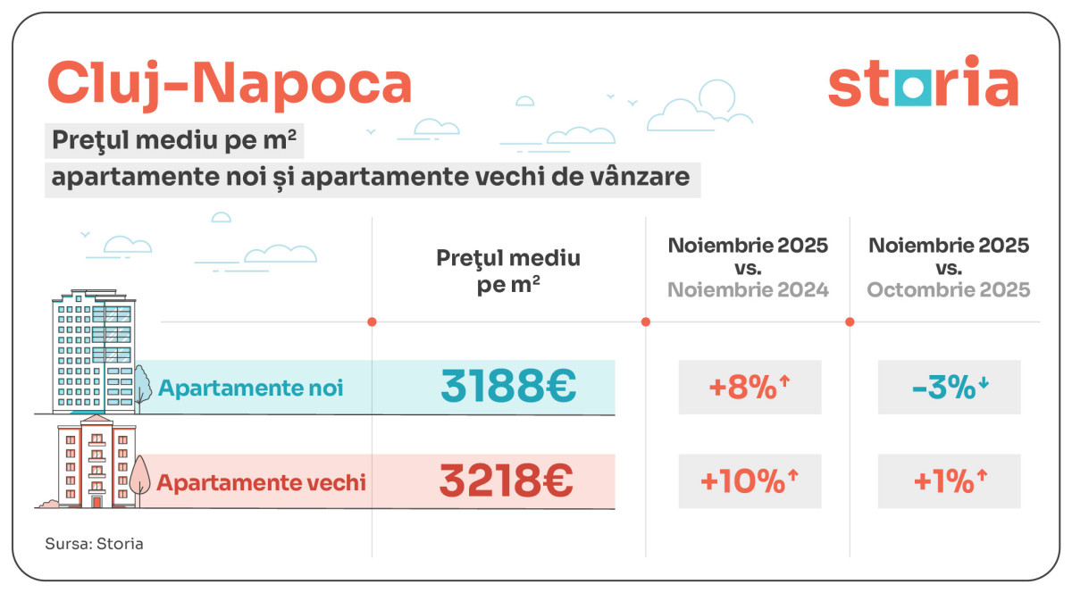 Cluj-Napoca rămâne cel mai scump oraș din țară, cu un preț mediu de 3.188 euro/mp pentru apartamentele noi, cu 8% mai mult decât anul trecut, dar cu 3% mai puțin decât în octombrie, și 3.218 euro/mp pentru cele vechi, în creștere cu 10% față de anul trecut și 1% față de luna anterioară.
