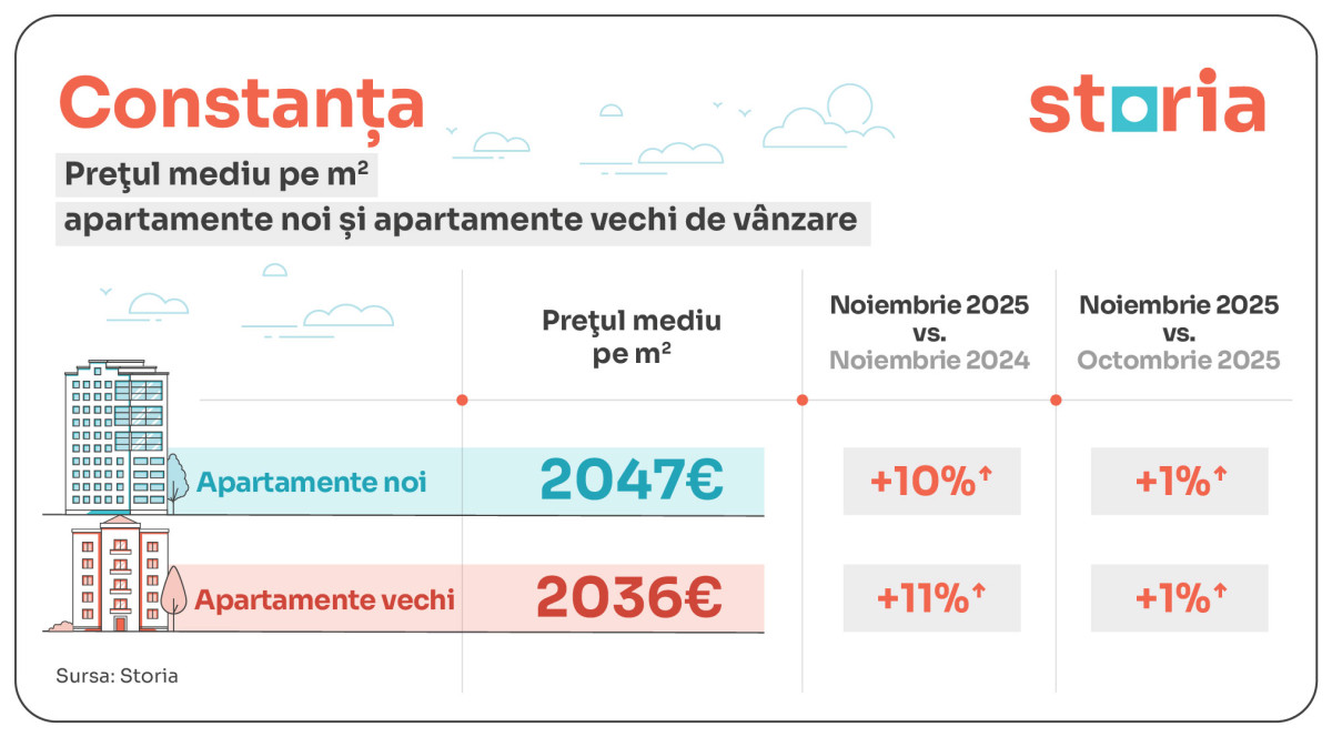În Constanța, prețul mediu solicitat a fost de 2.047 euro/mp pentru apartamentele noi, cu 10% mai mult decât anul trecut și 1% peste nivelul din octombrie, și 2.036 euro/mp pentru cele vechi, în creștere cu 11% față de anul trecut și 1% față de luna anterioară.