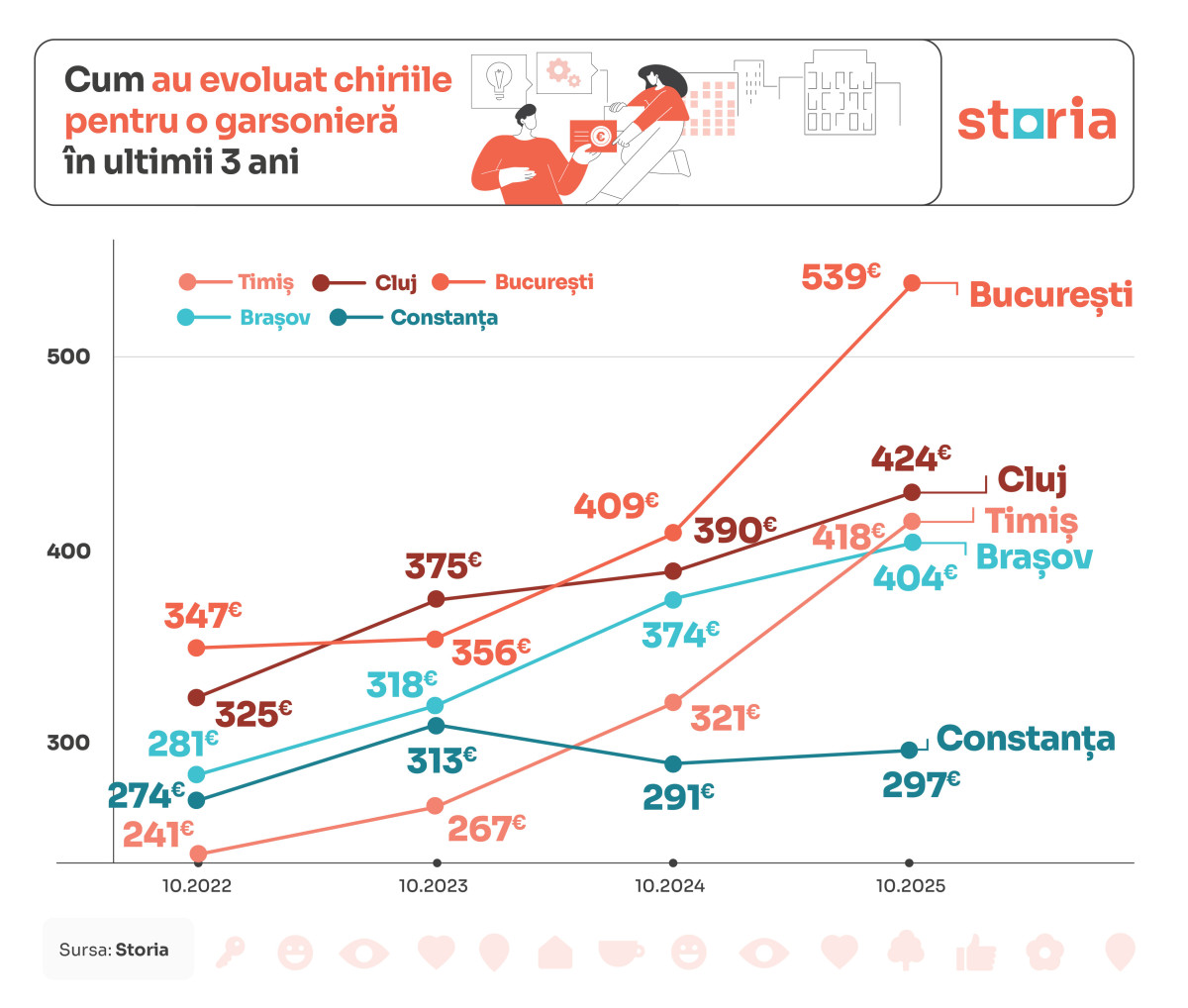Gradul de accesibilitate al chiriilor din principalele județe ale țării a fost calculat pe baza prețului mediu solicitat de proprietari pentru închirierea de garsoniere, apartamente cu două camere și apartamente cu trei camere în cadrul anunțurilor publicate pe platforma imobiliară Storia în luna octombrie din anii 2022, 2023, 2024 și 2025.