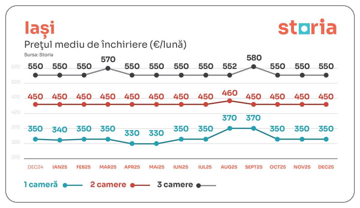 În Iași, prețul mediu de închiriere a fost de 350 euro pentru garsoniere, 450 euro pentru două camere și 550 euro pentru cele cu trei camere, nivelurile fiind constante față de decembrie 2024 și noiembrie 2025.