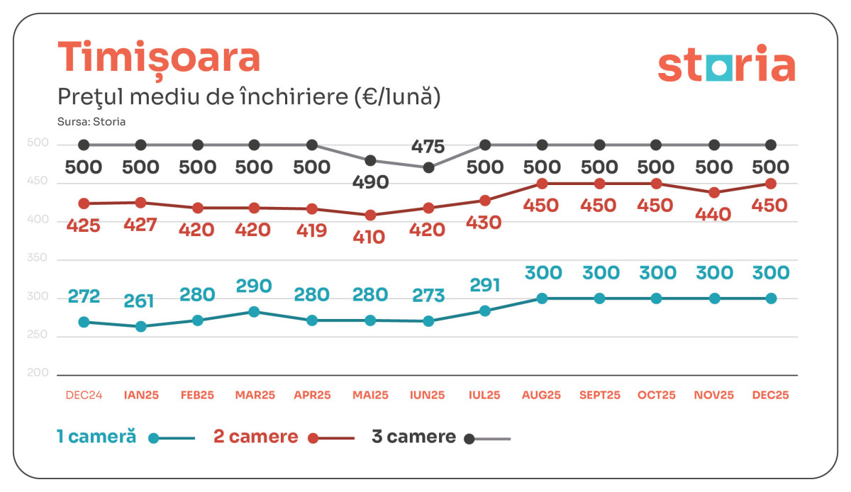 În Timișoara, chiriile medii au fost de 300 euro pentru garsoniere (+10% față de decembrie 2024), 450 euro pentru două camere (+6%), iar 500 euro pentru trei camere. Comparativ cu noiembrie 2025, aproape toate segmentele s-au menținut la același nivel, cu excepția apartamentelor cu două camere, care au crescut cu +2%.