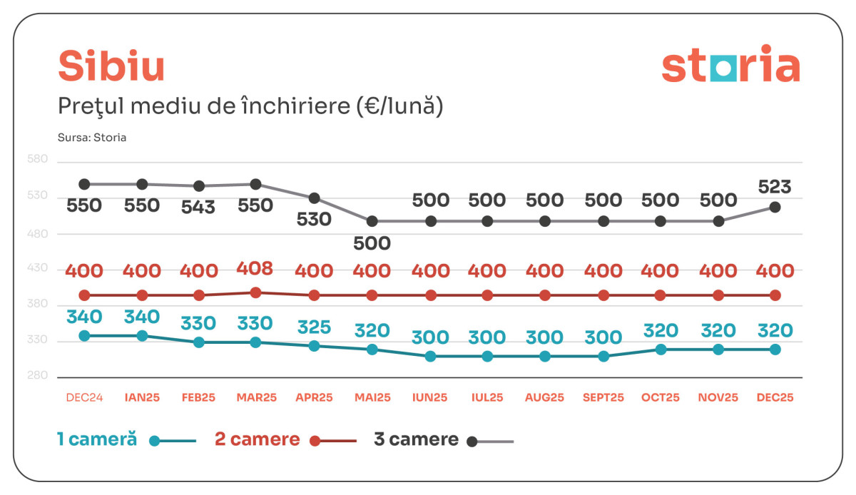 În Sibiu, garsonierele s-au închiriat cu 320 euro (-6% față de decembrie 2024), apartamentele cu două camere au rămas la 400 euro, iar cele cu trei camere la 523 euro (-5% față de anul anterior).