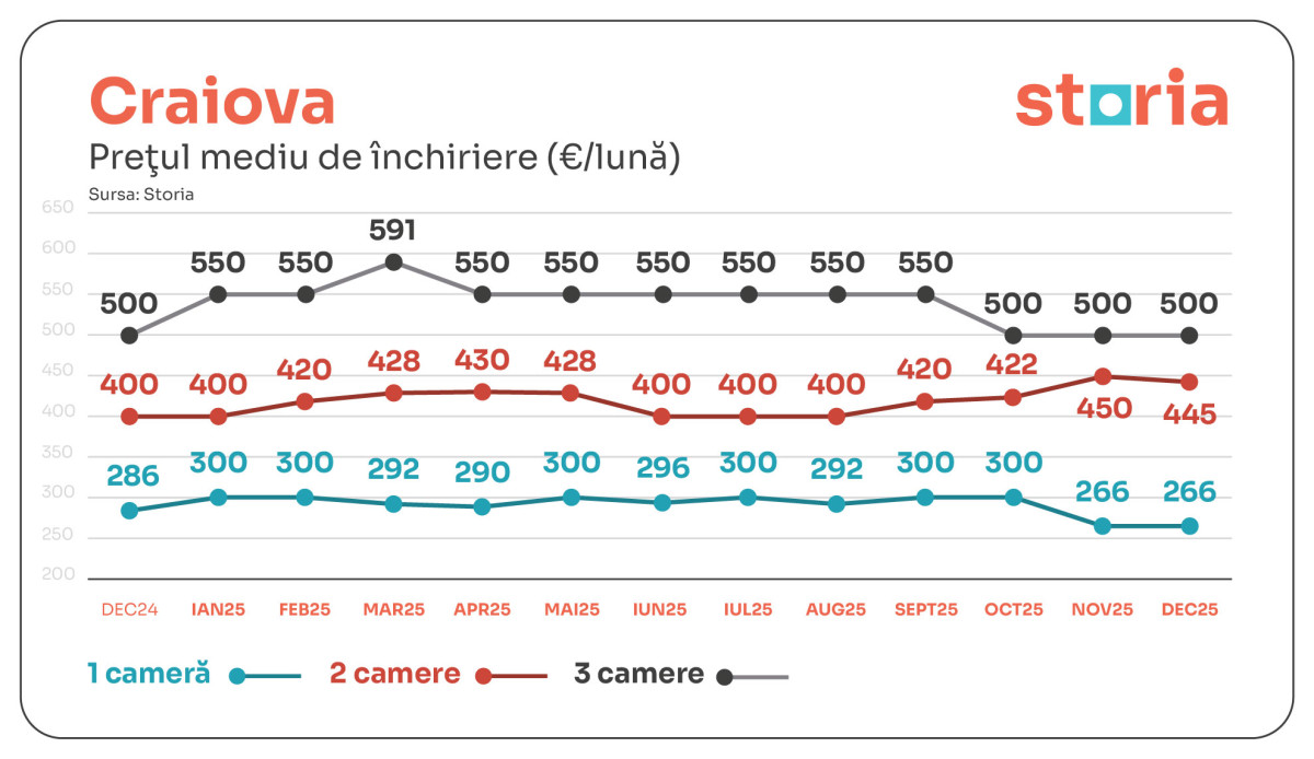 În Craiova, garsonierele s-au închiriat cu 266 euro (-7% față de decembrie 2024), apartamentele cu două camere cu 445 euro (+11%), iar cele cu trei camere cu 500 euro. Comparativ cu noiembrie, garsonierele și apartamentele cu trei camere au rămas constante, iar apartamentele cu două camere au înregistrat o scădere de -1%.