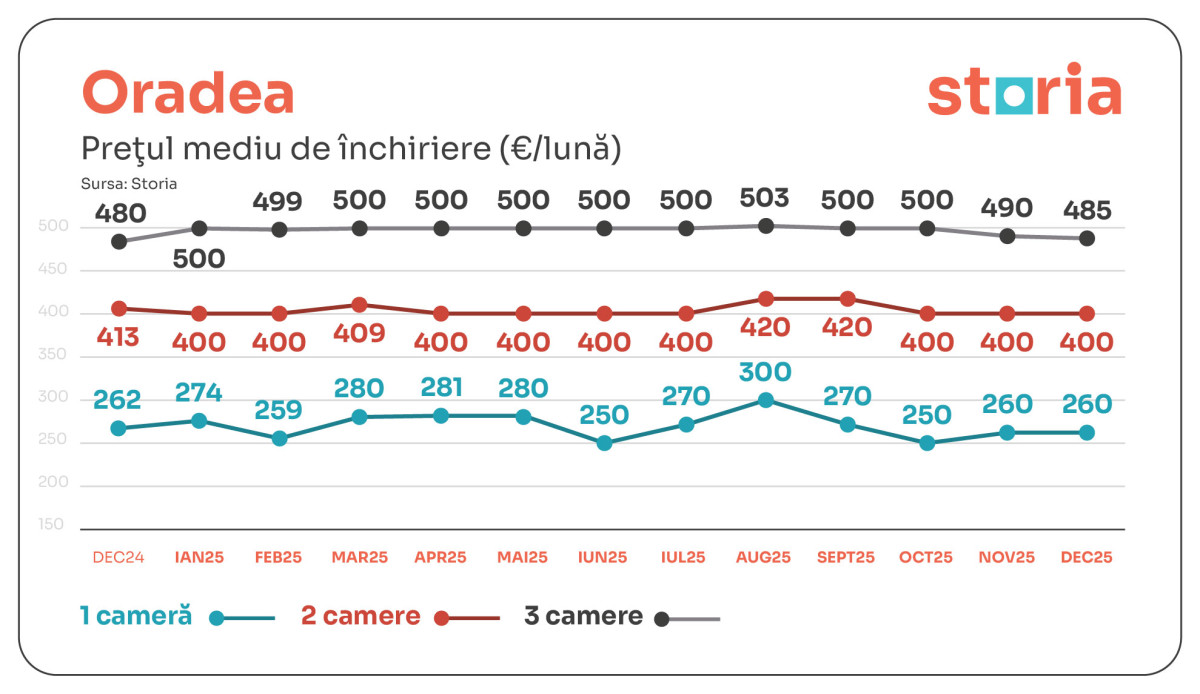 Luna decembrie 2025 a adus ajustări moderate pe piața chiriilor din marile orașe ale țării, potrivit analizei realizate de Storia – cea mai vizitată platformă imobiliară din România. Evoluțiile diferă de la un oraș la altul: în aproximativ jumătate dintre orașele analizate, prețurile medii ale chiriilor s-au menținut la același nivel sau au fost mai mici comparativ cu decembrie 2024, în timp ce în sudul și vestul țării au fost înregistrate creșteri punctuale. În decembrie 2025 comparativ cu decembrie 2024, Constanța și Iași sunt singurele orașe în care chiriile au rămas neschimbate la toate cele trei categorii de apartamente, în timp ce Craiova a consemnat cel mai mare avans anual, de +11% pentru chiria apartamentelor cu două camere, iar Timișoara a înregistrat creșteri de +10% pentru garsoniere și de +6% pentru apartamentele cu două camere.