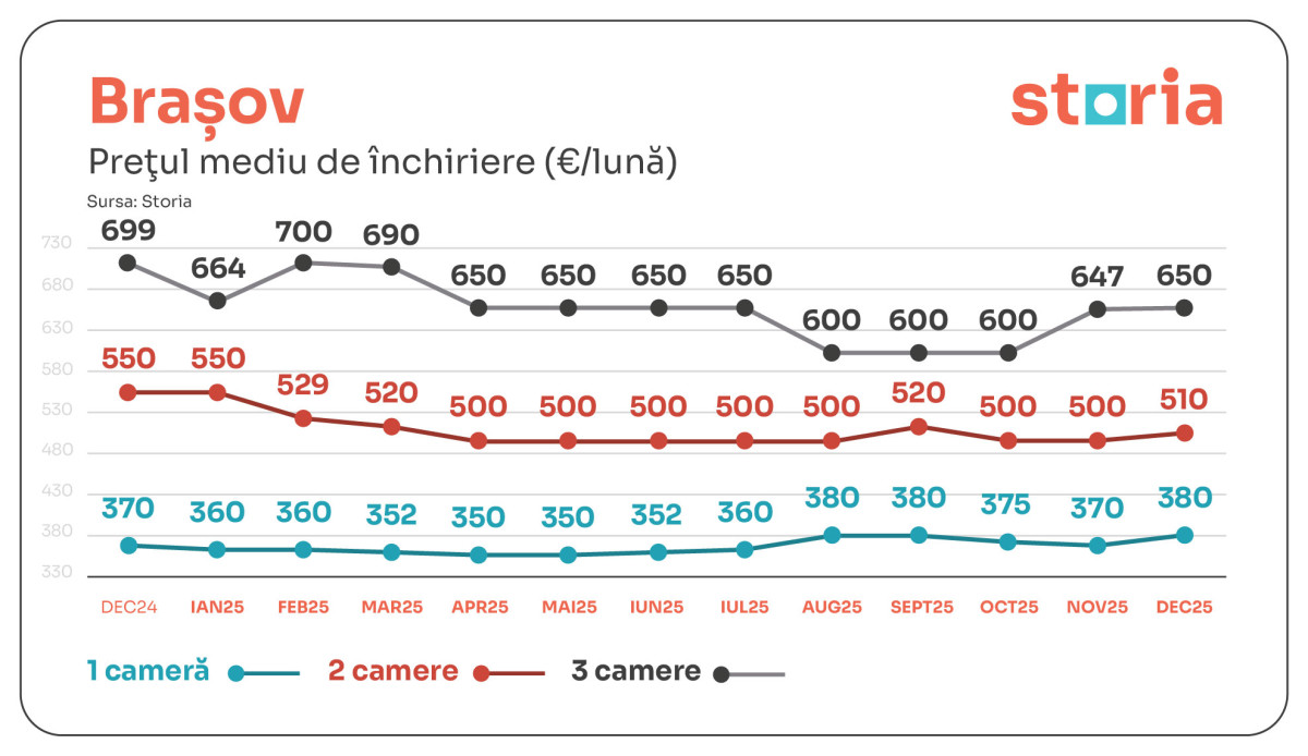 În Brașov, garsonierele s-au închiriat cu 380 euro (+3% față de decembrie 2024), apartamentele cu două camere cu 510 euro (-7%), iar cele cu trei camere cu 650 euro (-7%). Ajustările sunt mai vizibile la apartamentele cu două și trei camere, în timp ce garsonierele au înregistrat o creștere moderată.