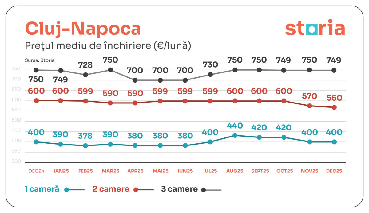 În Cluj-Napoca, chiriile medii au fost de 400 euro pentru garsoniere, 560 euro pentru două camere și 749 euro pentru cele cu trei camere. Comparativ cu decembrie 2024, garsonierele și apartamentele cu trei camere au rămas la același nivel, în timp ce apartamentele cu două camere au scăzut cu -7%. Comparativ cu luna noiembrie, aproape toate segmentele s-au menținut stabile, mai puțin apartamentele cu două camere, care s-au ieftinit cu -2%.