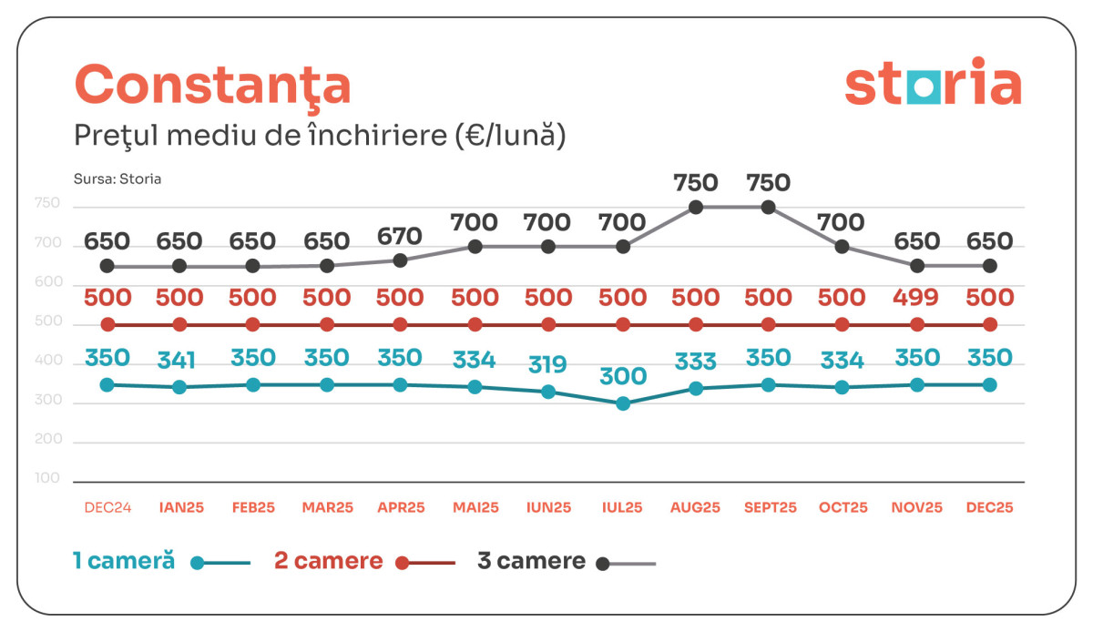 În Constanța, garsonierele s-au închiriat cu 350 euro, apartamentele cu două camere cu 500 euro, iar cele cu trei camere cu 650 euro. Nivelul chiriilor a rămas neschimbat față de decembrie 2024 și comparativ cu luna noiembrie 2025.
