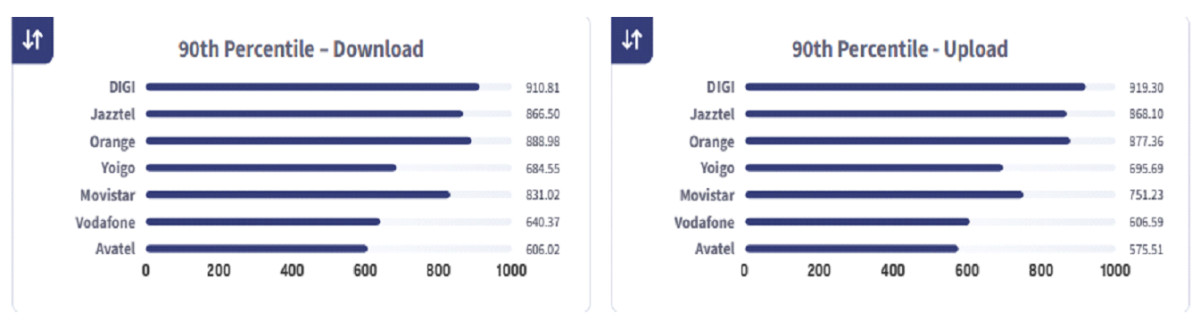 DIGI Spania a dominat clasamentul pe tot parcursul anului, ocupând poziția fruntașă și în primele șase luni ale lui 2025, cu un punctaj Speed Score™ de 77,29, susținut de viteze de până la 911,00 Mbps (download), respectiv 916,49 Mbps (upload).