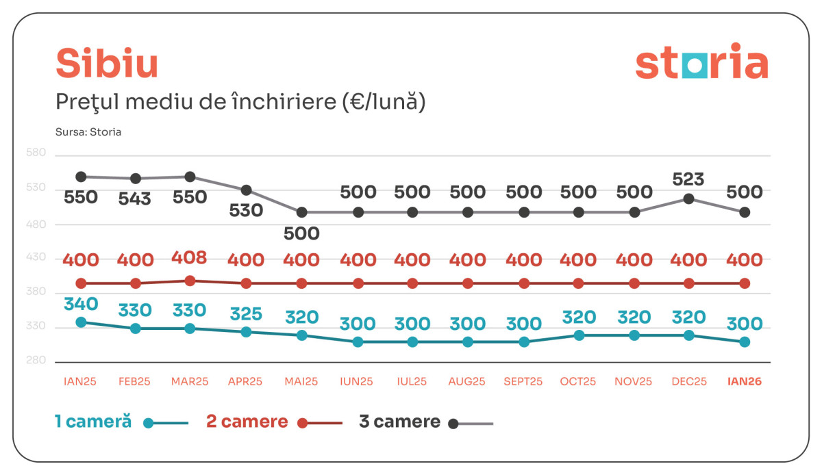 În Sibiu, garsonierele s-au închiriat cu 300 de euro, apartamentele cu două camere cu 400 de euro, iar cele cu trei camere cu 500 de euro. Față de anul trecut, garsonierele au scăzut cu 12%, iar apartamentele cu trei camere cu 9%, în timp ce segmentul de două camere a rămas stabil. Comparativ cu luna decembrie, garsonierele (-6%) și apartamentele cu trei camere (-4%) au continuat să se ieftinească.