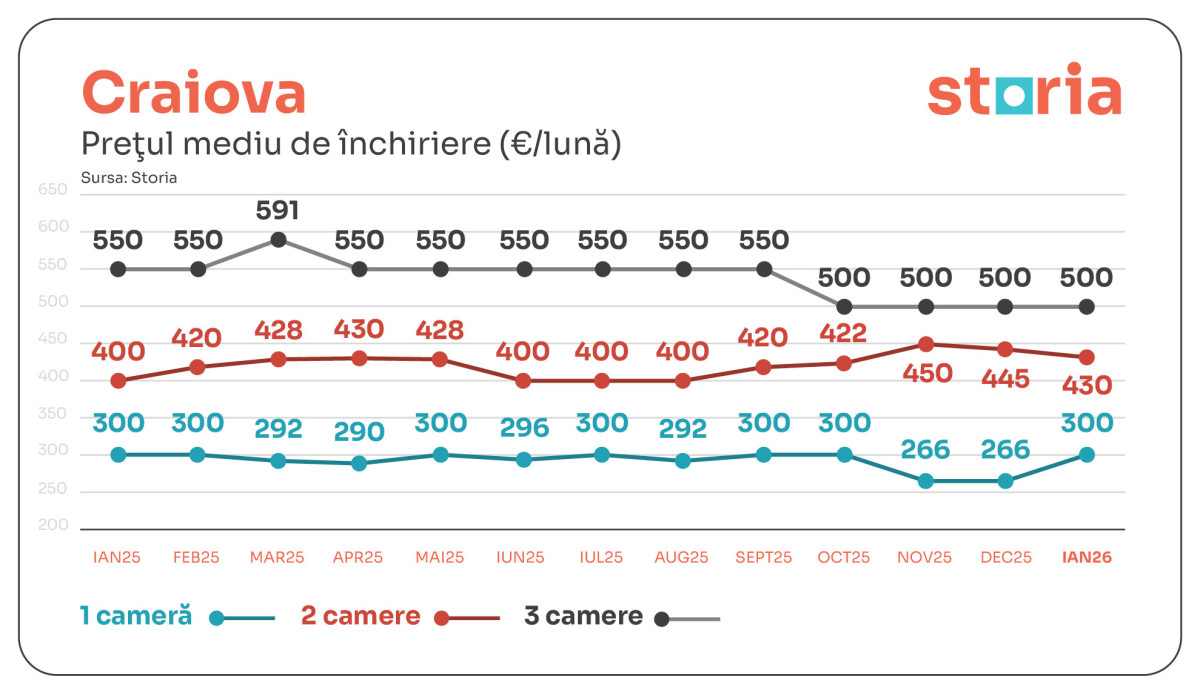 În Craiova, garsonierele s-au închiriat cu 300 de euro, apartamentele cu două camere cu 430 de euro, iar cele cu trei camere cu 500 de euro. Față de anul trecut, apartamentele cu două camere au crescut cu 8%, în timp ce garsonierele au rămas la un nivel similar, iar apartamentele cu trei camere s-au ieftinit cu 9%. Comparativ cu luna anterioară, decembrie 2025, garsonierele au înregistrat o creștere accentuată, de 13%.