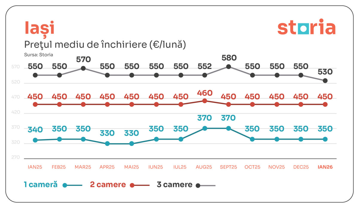 În Iași, prețurile medii de închiriere au fost de 350 de euro pentru garsoniere, 450 de euro pentru apartamentele cu două camere și 530 de euro pentru cele cu trei camere. Comparativ cu ianuarie 2025, garsonierele au crescut cu 3%, apartamentele cu două camere s-au menținut la același nivel ca în ianuarie 2025, iar cele cu trei camere au scăzut cu 4%. Față de luna decembrie, doar apartamentele cu trei camere au înregistrat o scădere, de 4%.