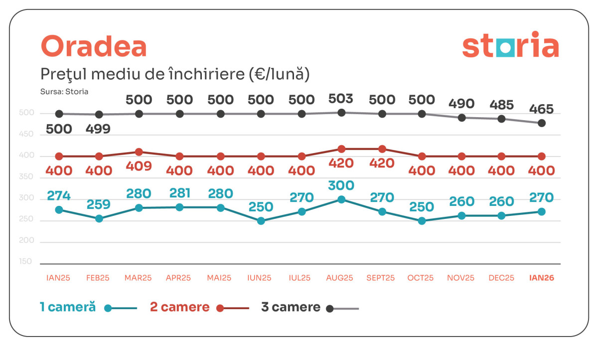La Oradea, chiriile medii au fost de 270 de euro pentru garsoniere, 400 de euro pentru apartamentele cu două camere și 465 de euro pentru cele cu trei camere. Comparativ cu ianuarie 2025, garsonierele au scăzut cu 1%, apartamentele cu două camere au rămas stabile, iar cele cu trei camere s-au ieftinit cu 7%. Față de luna precedentă, garsonierele au crescut cu 4%, iar apartamentele cu trei camere s-au ieftinit cu 4%.
