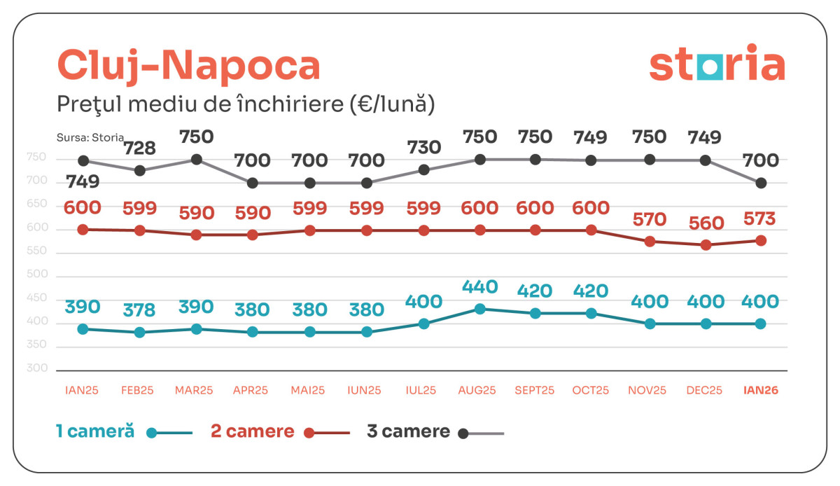 În Cluj-Napoca, chiriile medii din ianuarie 2026 au fost de 400 de euro pentru garsoniere, 573 de euro pentru apartamentele cu două camere și 700 de euro pentru cele cu trei camere. Față de ianuarie 2025, garsonierele au înregistrat o creștere de 3%, în timp ce apartamentele cu două camere s-au ieftinit cu 5%, iar cele cu trei camere s-au ieftinit cu 7%. Comparativ cu luna decembrie 2025, segmentul de două camere a crescut cu 2%, în timp ce apartamentele cu trei camere au scăzut cu 7%.