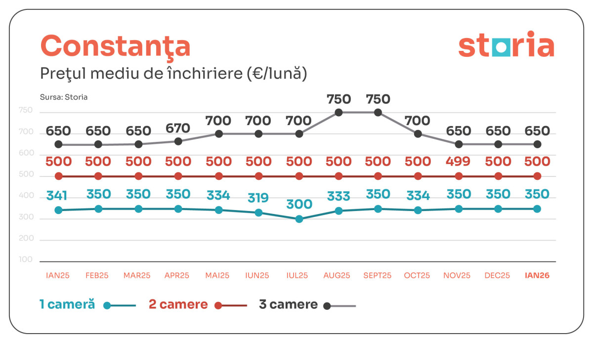 În Constanța, garsonierele s-au închiriat cu 350 de euro, apartamentele cu două camere cu 500 de euro, iar cele cu trei camere cu 650 de euro. Nivelurile chiriilor au rămas neschimbate atât față de anul trecut, cât și comparativ cu luna decembrie 2025, aproape pentru toate cele trei tipuri de locuințe, cu o singură excepție - garsonierele, unde prețul a crescut cu 3% față de ianuarie 2025.