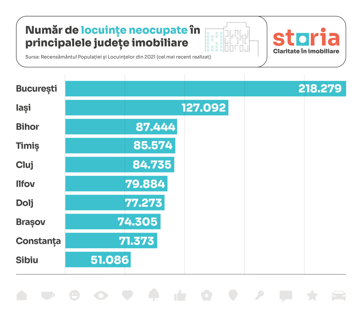 Astfel, pe parcursul perioadei de 10 ani dintre cele două recensăminte, numărul total de locuințe existente a crescut cu 13,7% la nivel național, la peste 9,9 milioane de unități, însă în același timp numărul total de locuințe neocupate a crescut cu 76,4%, de la 1,4 milioane la peste 2,5 milioane de unități, potrivit unei analize realizate de Storia – cea mai vizitată platformă imobiliară din România.