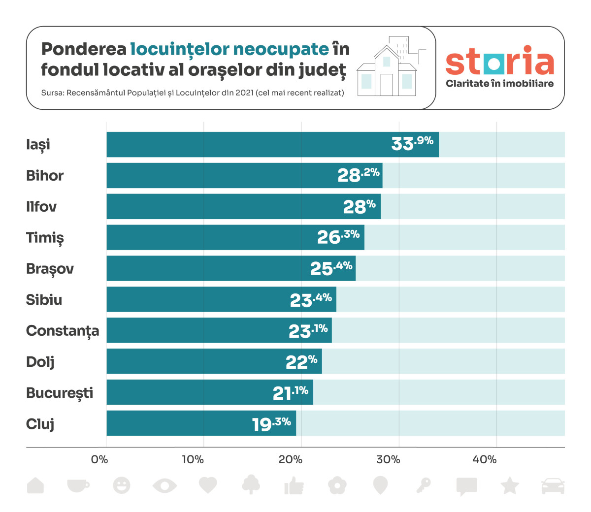 - Iași și Bihor înregistrează cele mai ridicate ponderi ale locuințelor neocupate în orașe, cu 33,9%, respectiv 28,2%