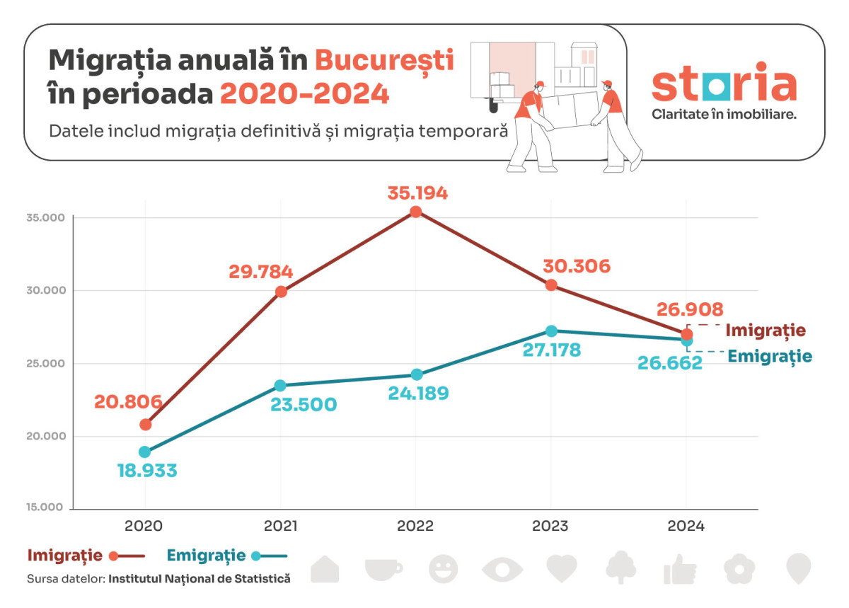 Astfel, peste 31.500 de bucureșteni s-au mutat definitiv în străinătate în perioada 2020-2024, iar alți 39.000 de români au revenit definitiv în România și și-au stabilit domiciliul în București. Cu alte cuvinte, în acest interval recent de cinci ani, populația Capitalei a înregistrat un spor de 7.500 de locuitori pe segmentul de migrație externă definitivă.
