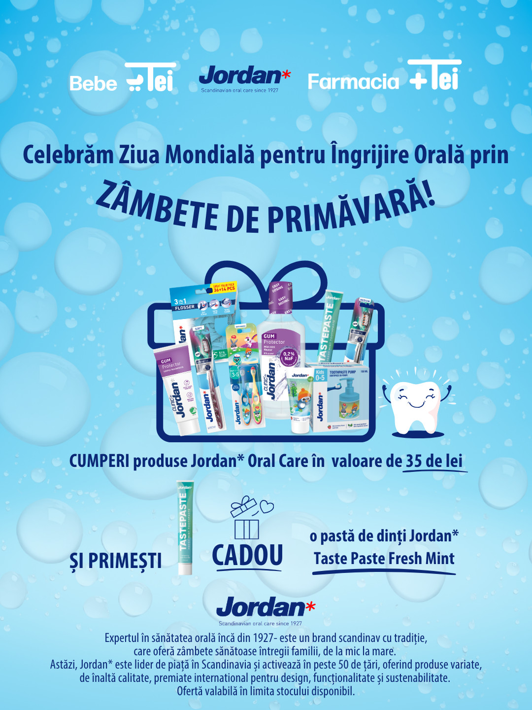 Pe lângă componenta informativ-educativă, campania include și oferte de preț atractive. Astfel, consumatorii primesc o pastă de dinți Fresh Mint, cu aromă revigorantă de mentă proaspătă, la achiziția de produse Jordan* de minimum 35 de lei din locațiile Bebe Tei și Farmacia TEI partenere, dar și online.