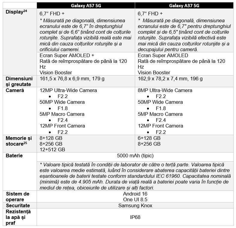 [11] Rezoluția de 50 MP este disponibilă numai pe camera cu unghi larg din spate a modelelor Galaxy A57 5G și A37 5G.