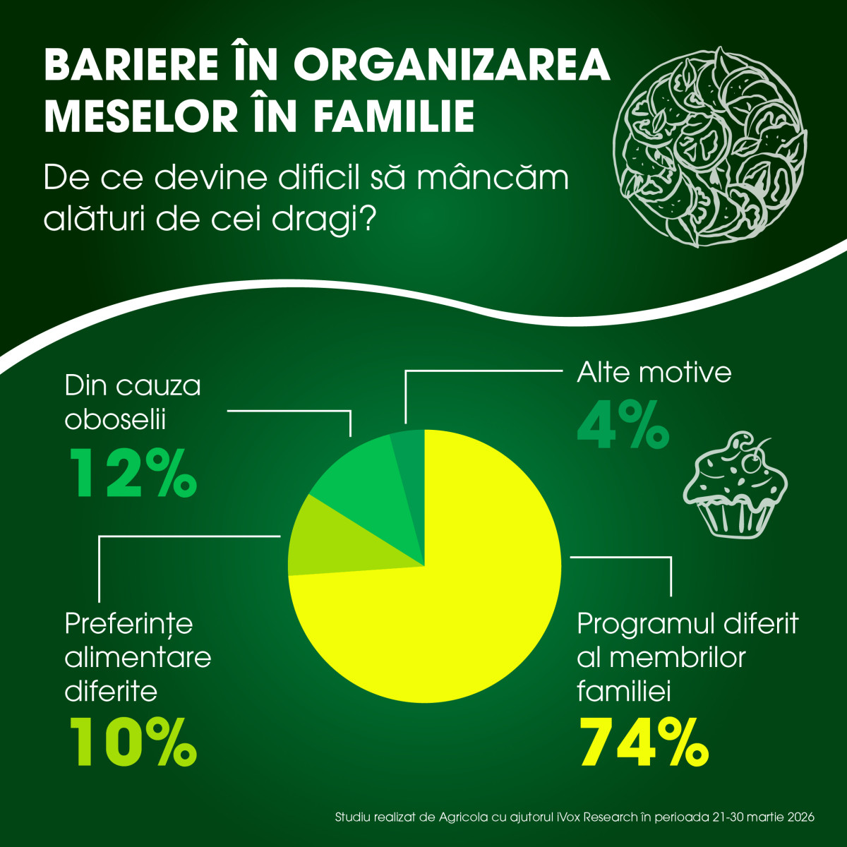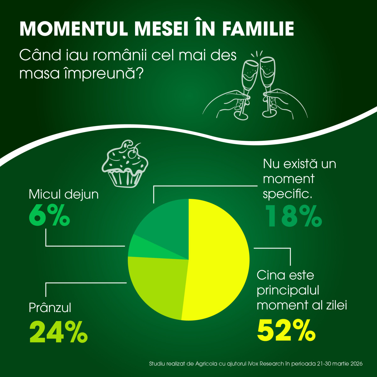 * Studiul „Mesele în familie la români” a fost realizat cu ajutorul platformei iVox Research, în perioada 20-31 martie 2026, pe un eșantion de 1.121 de respondenți adulți din România.