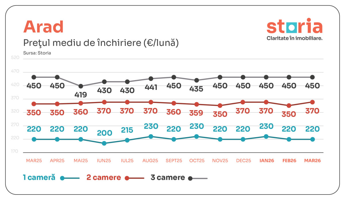 În Arad, locul cu cele mai mici chirii dintre orașele analizate, garsonierele au avut un preț mediu de 220 de euro, apartamentele cu două camere 370 euro, în creștere cu 6% față de anul anterior, iar cele cu trei camere 450 euro, la un nivel similar celui din martie 2025.