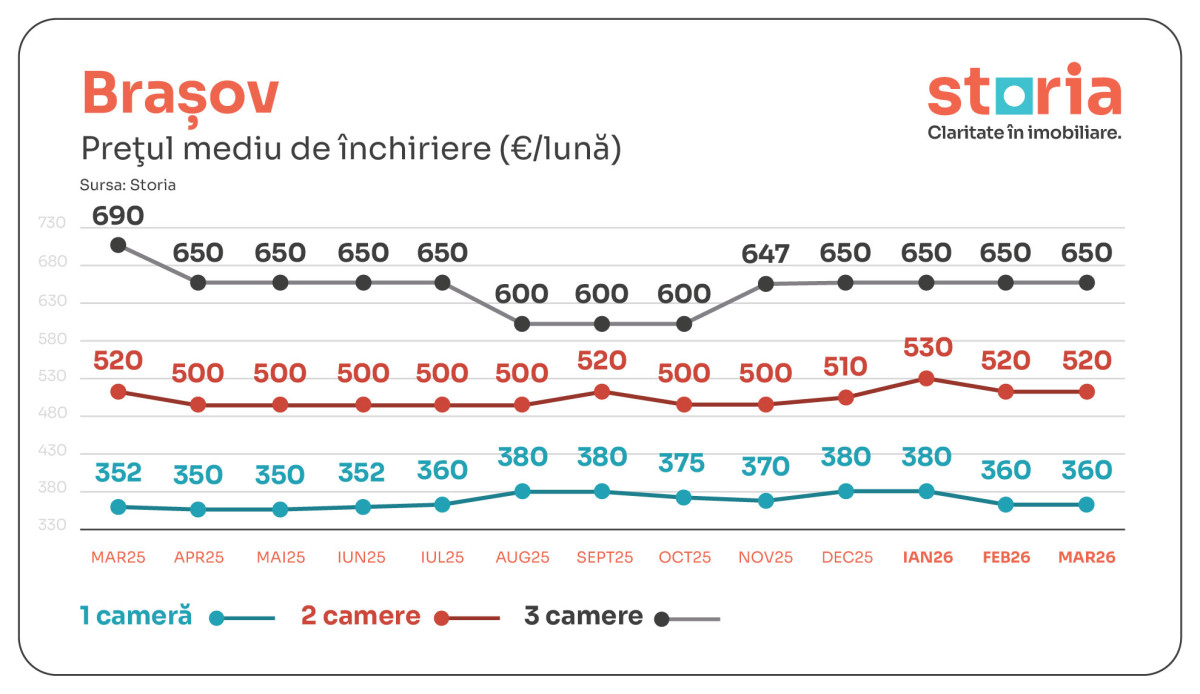 În Brașov, chiriile medii au fost de 360 de euro pentru garsoniere, 520 euro pentru două camere și 650 euro pentru trei camere. Față de martie anul trecut, garsonierele au crescut cu 2%, apartamentele cu două camere au rămas la un nivel similar, iar cele cu trei camere au scăzut cu 6%.