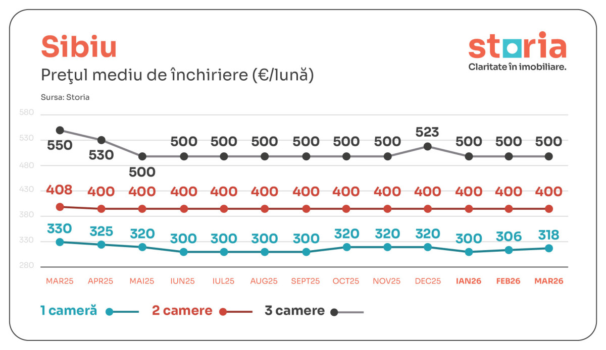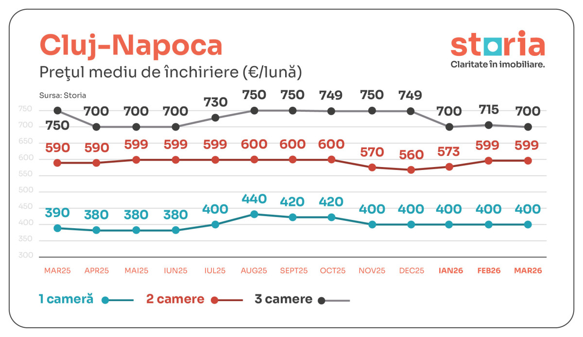 Cluj-Napoca rămâne, după București, cea mai scumpă piață de închiriere dintre orașele analizate. În martie 2026, chiriile au fost de 400 de euro pentru garsoniere, 599 euro pentru apartamentele cu două camere și 700 euro pentru cele cu trei camere. Comparativ cu martie 2025, garsonierele au crescut cu 3%, apartamentele cu două camere cu 2%, în timp ce apartamentele cu trei camere au înregistrat o scădere de 7%.