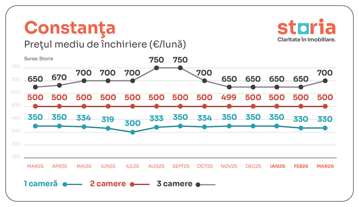 Constanța a înregistrat o evoluție mixtă. Garsonierele s-au închiriat cu 330 de euro, în scădere cu 6% de la un an la altul, apartamentele cu două camere au avut un preț mediu de 500 de euro, similar celui din martie 2025, iar apartamentele cu trei camere au ajuns la 700 de euro, în creștere cu 8%.