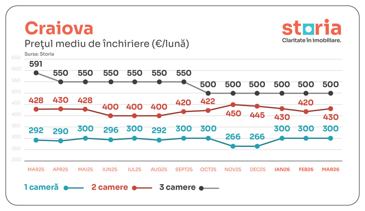 În Craiova, chiriile au fost de 300 de euro pentru garsoniere, 430 euro pentru două camere și 500 euro pentru trei camere. Comparativ cu anul trecut, garsonierele au crescut cu 3%, apartamentele cu două camere au rămas stabile, iar cele cu trei camere au scăzut cu 15%.