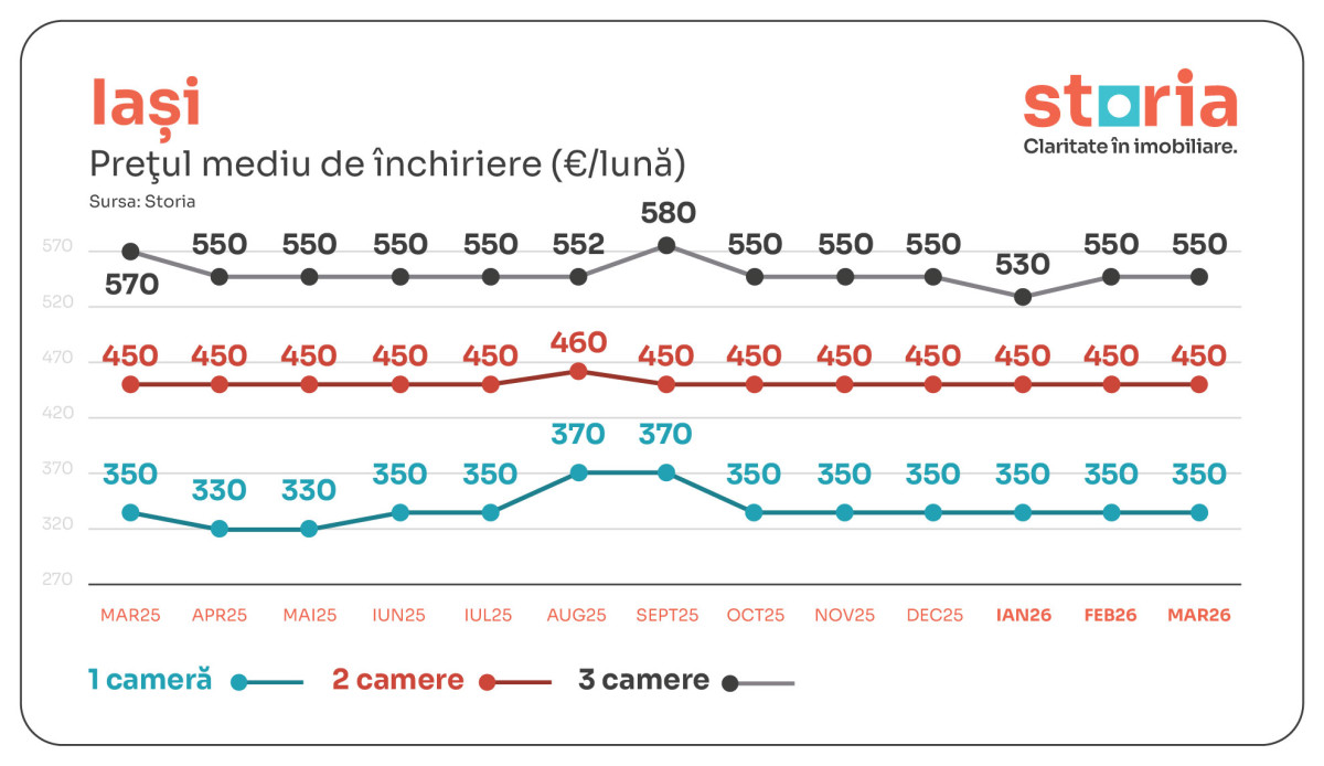 În Iași, piața chiriilor a rămas relativ stabilă. Garsonierele s-au închiriat cu 350 de euro, apartamentele cu două camere cu 450 euro, ambele la niveluri similare cu cele de anul trecut, în timp ce apartamentele cu trei camere au avut un preț mediu de 550 de euro, în scădere cu 4%.