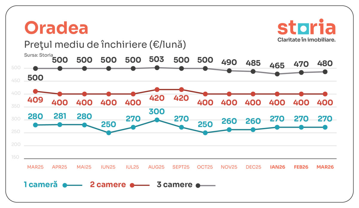 Oradea continuă să se numere printre orașele cu cele mai mici prețuri la chirii. În martie 2026, garsonierele au avut un preț mediu de 270 de euro, în scădere cu 4%, apartamentele cu două camere 400 euro (-2%), iar cele cu trei camere 480 euro, cu 4% sub nivelul din martie 2025.