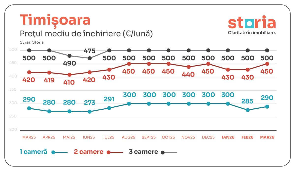 Timișoara se remarcă prin cea mai mare creștere anuală pe segmentul apartamentelor cu două camere, deși se află în continuare în topul principalelor orașe cu chirii ieftine. În martie 2026, garsonierele s-au închiriat cu 290 de euro, la un nivel similar celui din martie 2025, apartamentele cu două camere cu 450 euro, în creștere cu 7%, iar cele cu trei camere cu 500 euro, la un nivel similar celui de anul trecut.