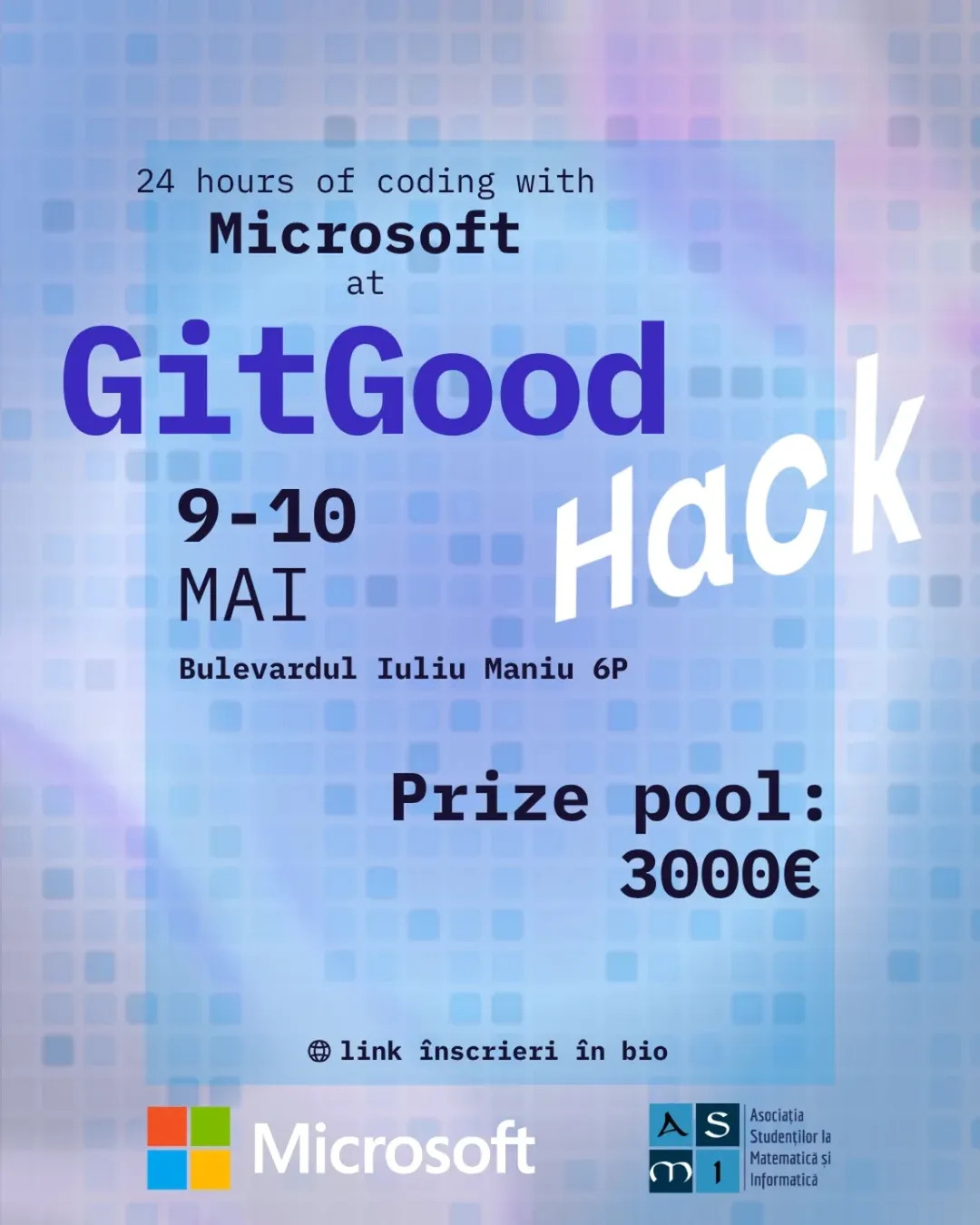 Ești gata să îțitestezi abilitățile de programare folosind tehnologii de ultimă oră? Asociația Studenților la Matematică și Informatică (ASMI) te invită să participi la prima ediție a hackathon-ului GitGood Hack. Evenimentul va avea loc fizic în perioada 9-10 mai 2026, desfășurându-se într-un cadru aparte: sediul Microsoft Romania (Campus 6.2 Building, Bd. Iuliu Maniu 6P, București).